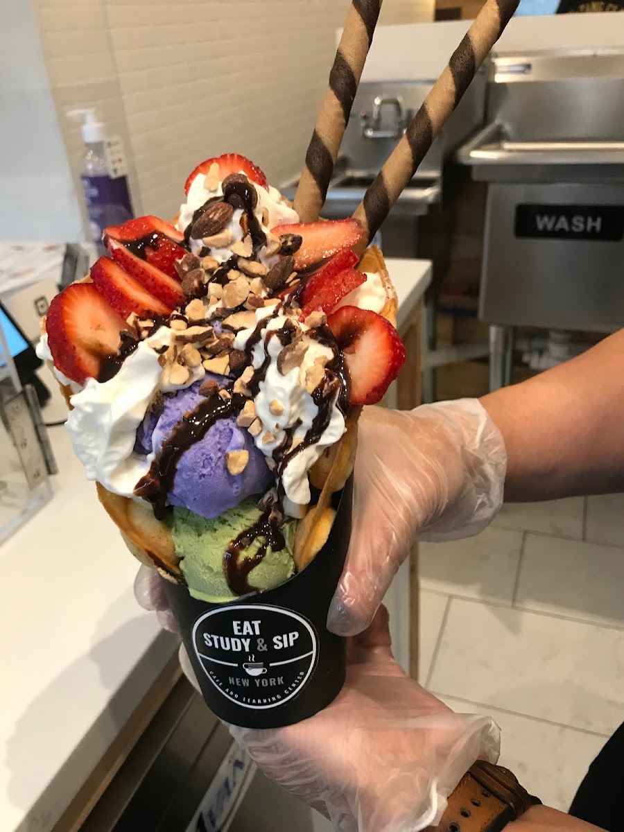 One of the standout features of Eat Study & Sip is its signature menu items, which will surely keep you coming back for more. First up, the Mochi Donuts are a must-try. Soft, chewy, and slightly crispy on the outside, these donuts offer a delightful texture that's both unique and satisfying. Pair them with a refreshing Brown Sugar Boba drink, and you have the perfect combination of sweet and chewy goodness. For tea lovers, the Taro Milk Tea is an absolute favorite - smooth, creamy, and full of flavor, it’s a great way to unwind and treat yourself. If you’re in the mood for something a little extra, the Bubble Waffle Ice Cream is a crowd-pleaser. With its crispy exterior and creamy, ice cream-filled center, it’s the perfect dessert for a sweet, indulgent treat.